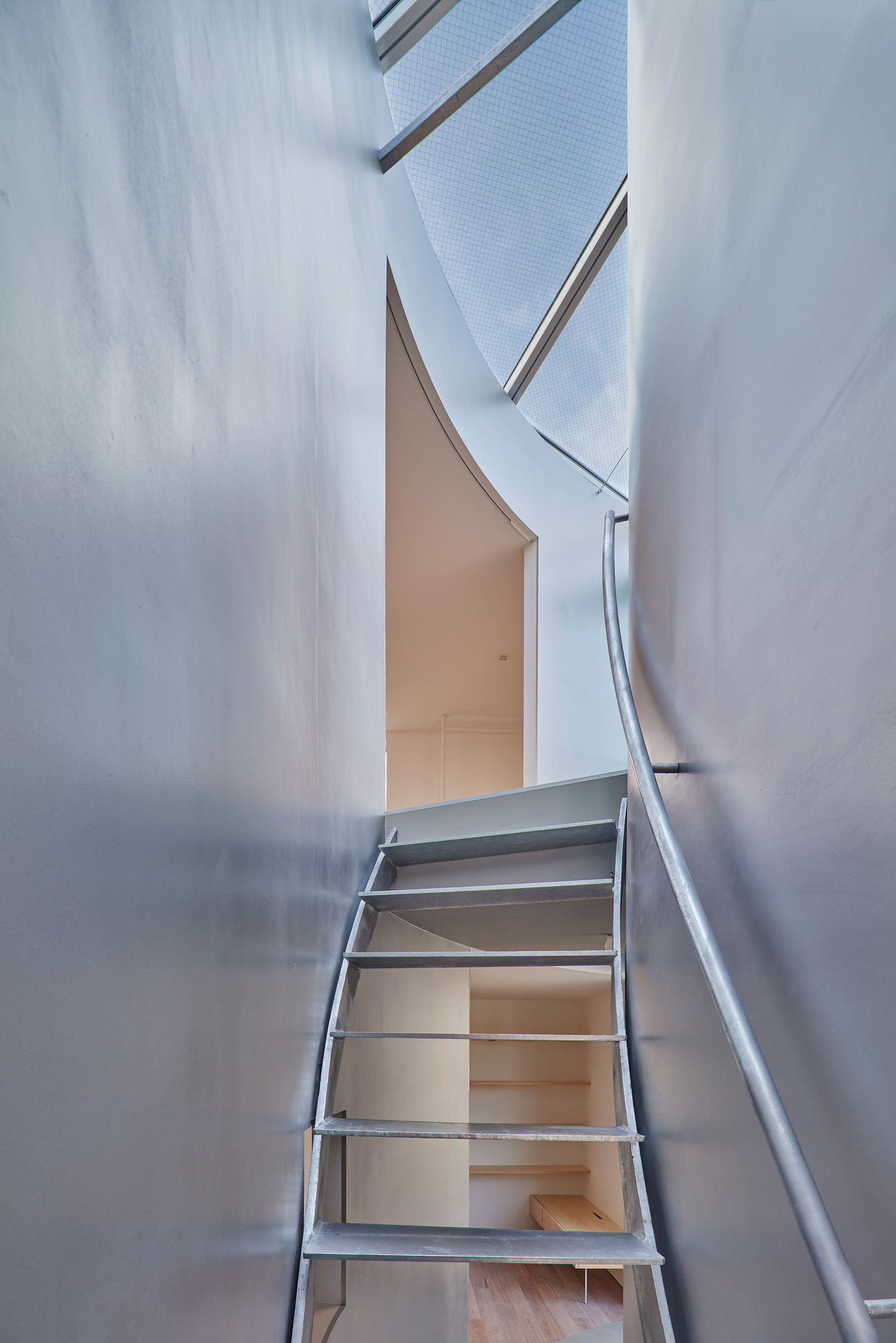 敷地は都心の住宅街で分筆され小さくなった土地。住宅が建ち並ぶ環境下で、庭先に植えられている木々や道端に生えている雑草、街路樹が落とす木漏れ日、建物の間から見える空などふと目を凝らすと心打たれる瞬間がある。街の風景を引き込む三層吹抜けの谷を建物中央へ配置し、開口部とガラスで覆った。谷の表面をシルバーとすることで、街へ散らばっている些細な風景を掬い、その風景のうつろいと共に過ごす住宅。